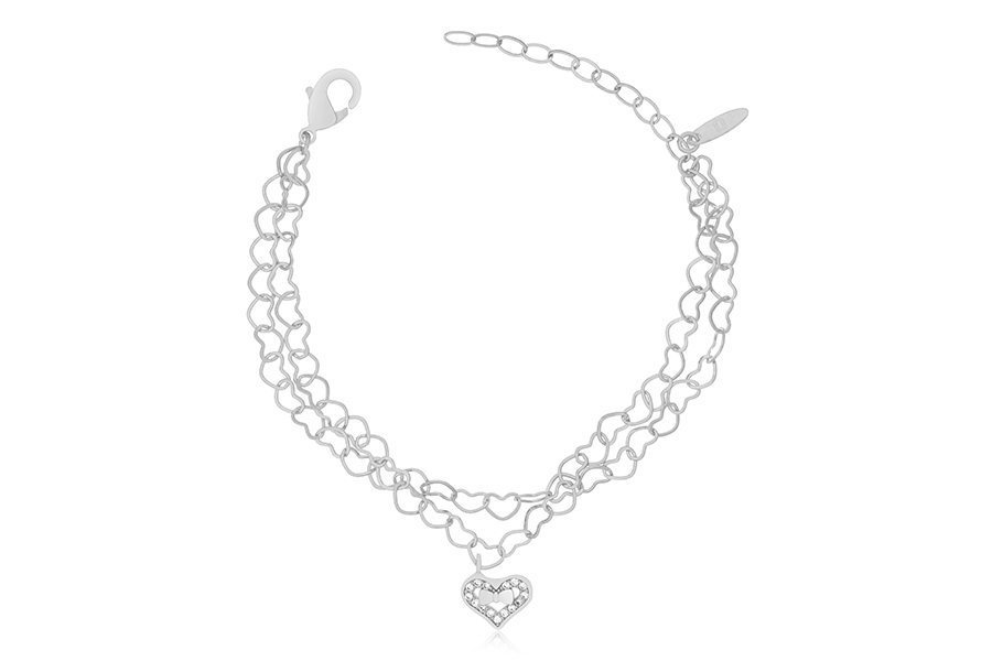 PULSEIRA BANHADA EM RÓDIO BRANCO, DUPLA, ELO CORAÇÃO 4,10mm LARGURA, 16cm COMPRIMENTO, EXTENSOR 5cm COMPRIMENTO E CORAÇÃO LAÇO 10mm LARGURA