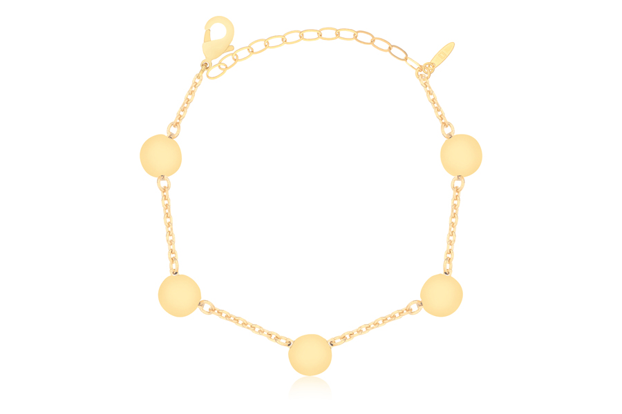 PULSEIRA BANHADA EM OURO, ELO OVAL 2,40mm, COM 5 ESFERAS 8mm, 16cm COMPRIMENTO E EXTENSOR 5cm