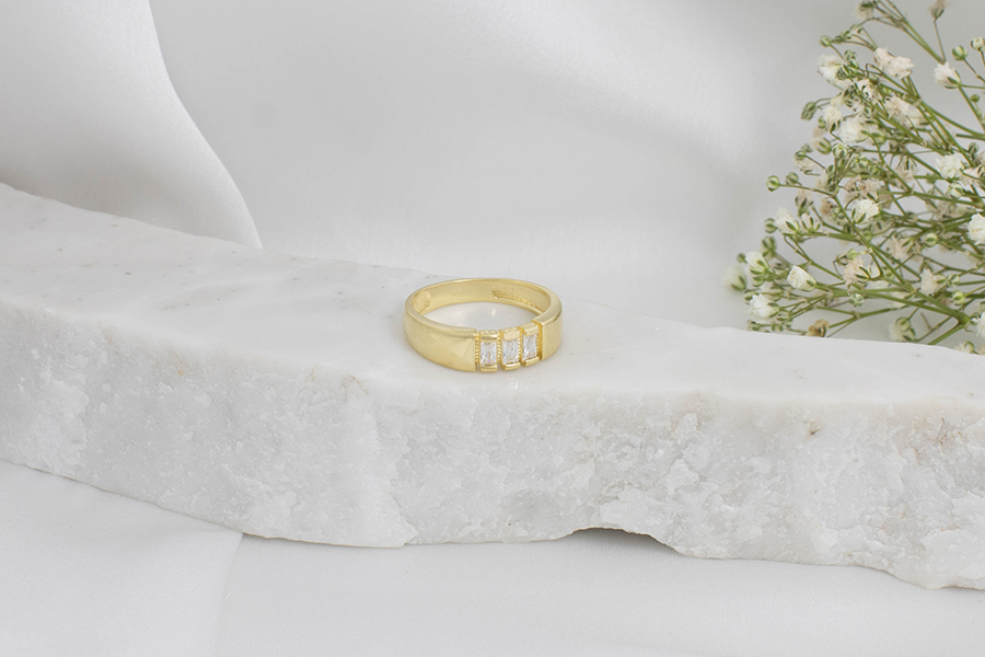 ANEL BANHADO EM OURO, 3 FIOS TRABALHADOS, COM ZIRCÔNIAS