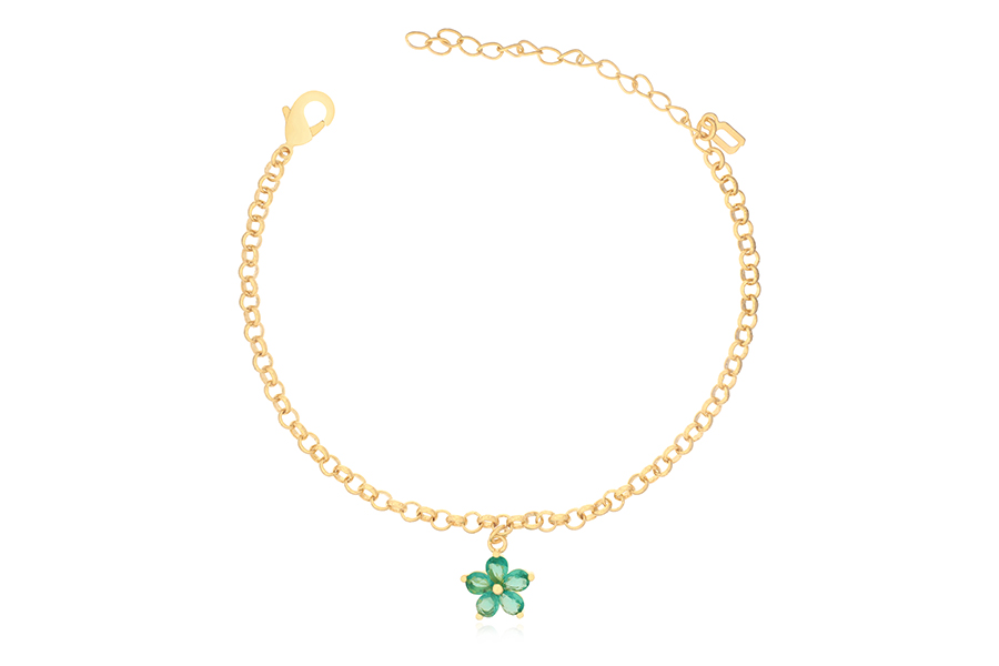 PULSEIRA BANHADA EM OURO, ELO PORTUGUÊS 3mm, 16cm COMPRIMENTO, EXTENSOR 5cm COMPRIMENTO E FLOR 10mm LARGURA