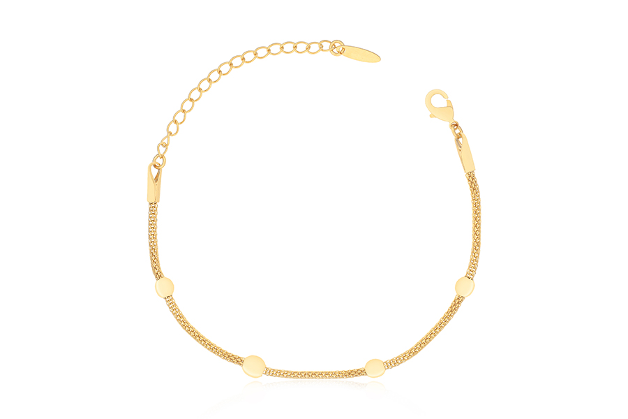 PULSEIRA BANHADA EM OURO, ELO 2mm, COM 5 ESFERAS 4mm, 16cm COMPRIMENTO E EXTENSOR 5cm COMPRIMENTO