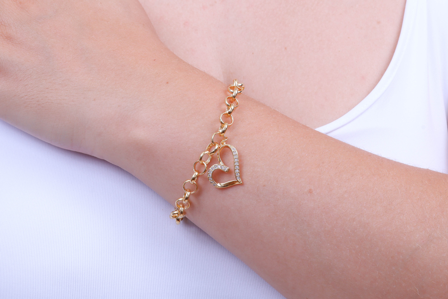 PULSEIRA BANHADA EM OURO, ELO PORTUGUÊS 7mm DIÂMETRO, 1,90mm ESPESSURA, 19cm COMPRIMENTO SEM EXTENSOR E CORAÇÃO 22mm COMPRIMENTO