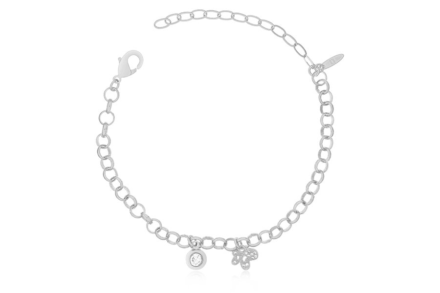 PULSEIRA BANHADA EM RÓDIO BRANCO, ELO PORTUGUÊS 5mm, 17cm COMPRIMENTO, EXTENSOR 5cm COMPRIMENTO, PONTO DE LUZ E BORBOLETA 9mm LARGURA