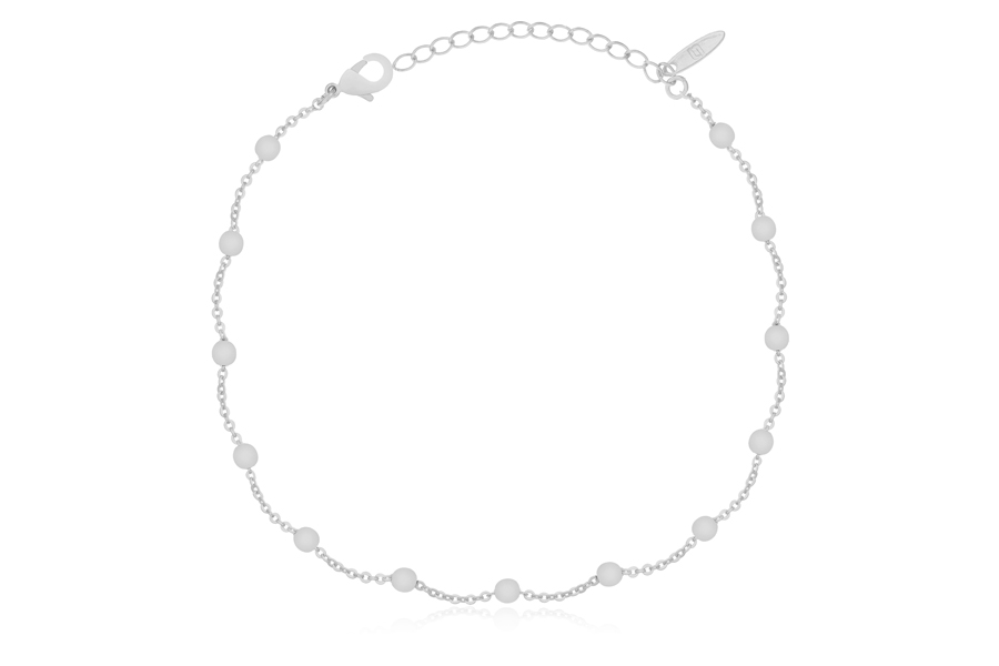 TORNOZELEIRA BANHADA EM RÓDIO BRANCO, ELO 1,40mm, ESFERAS 3mm, 22cm COMPRIMENTO E EXTENSOR 5cm