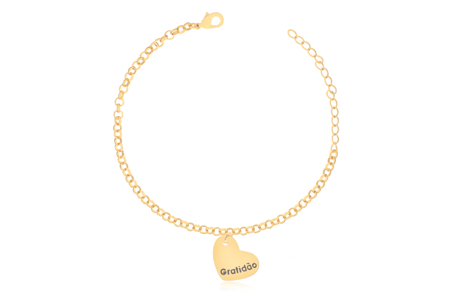 PULSEIRA BANHADA EM OURO, ELO PORTUGUÊS 3mm, 17cm COMPRIMENTO, EXTENSOR 5cm E CORAÇÃO GRATIDÃO 20mm LARGURA