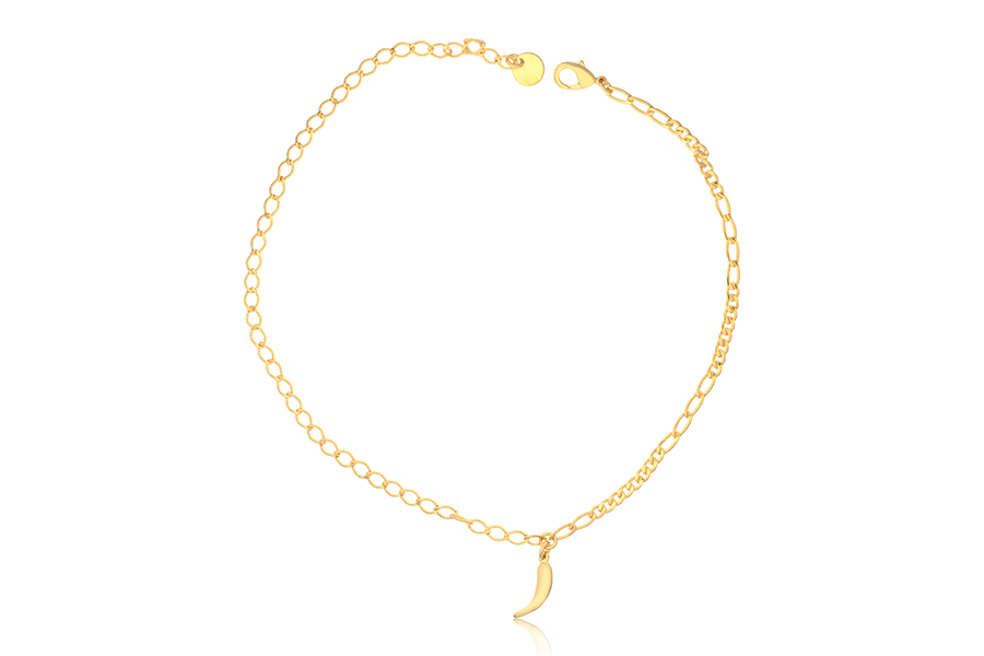 TORNOZELEIRA BANHADA EM OURO, ELO 2,40mm E 2,80mm, 27cm DE COMPRIMENTO COM O EXTENSOR E PIMENTA 13mm ALTURA