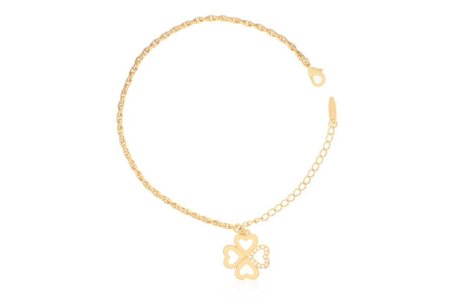 PULSEIRA BANHADA EM OURO, ELO 2,20mm, 16cm COMPRIMENTO, EXTENSOR 5cm E TREVO 16mm LARGURA