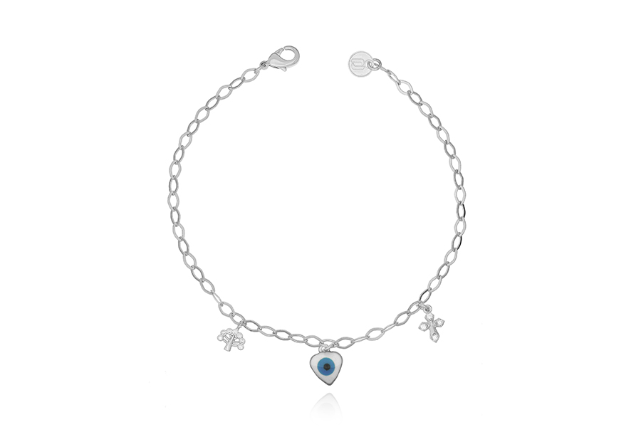 PULSEIRA BANHADA EM RÓDIO BRANCO, ELO OVAL 3mm LARGURA, ÁRVORE DA VIDA, CRUZ, OLHO GREGO CORAÇÃO, 20cm DE COMPRIMENTO SEM EXTENSOR